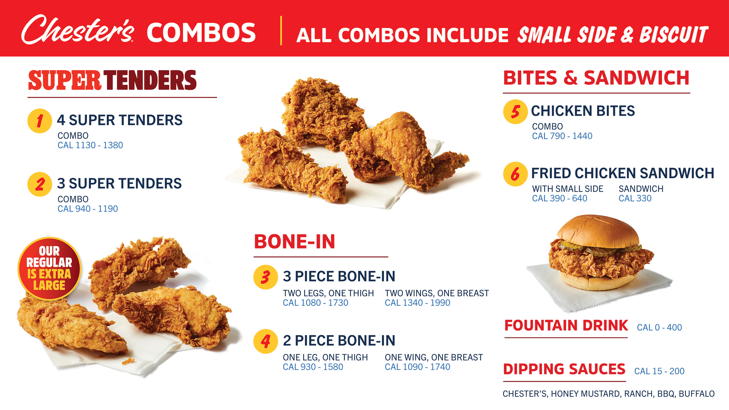 Looking for a quick and convenient meal for the whole family? We’ve got you covered! Try a bone-in or tenders Family Meal with a box of biscuits and homestyle sides to fill up everyone around the table. Pick up a Family Meal today at your local Chester’s!